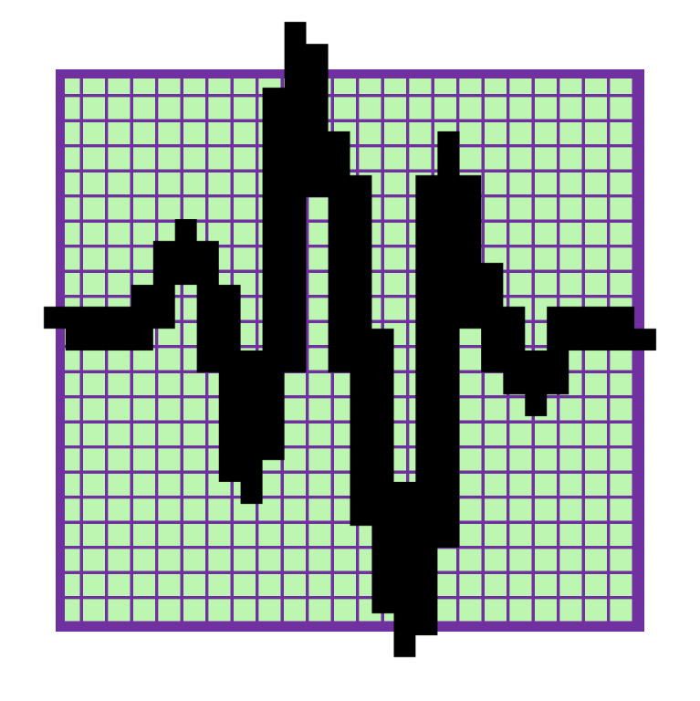 Der DataSonifyer ist vorwiegend ein Sound-Tool – dennoch gibt dir die Visualisierung (die grüne Leinwand) einen Anhaltspunkt dafür, wie deine Daten aussehen. Sobald du einen Datensatz erfolgreich geladen hast, wird automatisch die erste Spalte des Datensatzes im „Frequency“-Modul ausgewählt und visualisiert. Die Daten werden so angezeigt, wie man es aus Visualisierungen kennt: Pro Datenpunkt ein Kästchen und je höher der Datenwert, desto höher das Kästchen.
